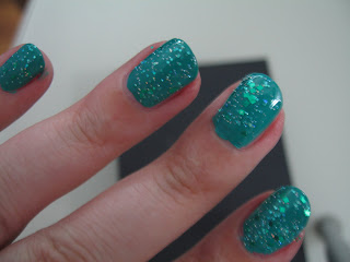 La base è un verde – azzurro tendente più al verde, molto bella: lo smalto è coprente fin dalla prima passata, non liquido, lucido; il top coat è uno smalto trasparente glitterato piuttosto denso, la cui particolarità sta nella forma dei glitter, un po’ tondi e un po’ quadrati, di diverse dimensioni.Al tatto, una volta passato il top coat la superficie dell’unghia non si presenta più liscissima a causa della presenza dei glitter, tuttavia non si tratta di un grande inconveniente.