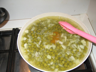 Ho iniziato affettando una cipolla e mettendola a imbiondire in padella, in seguito, ho aggiunto i piselli lasciandoli insaporire qualche minuto; invece di preparare il brodo a parte, ho messo direttamente il cuore di brodo alle verdure in padella, coprendo il tutto con mezzo litro di acqua bollente.