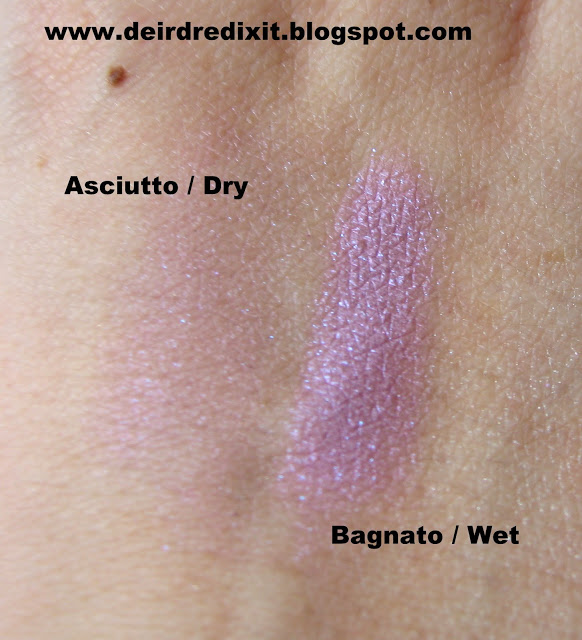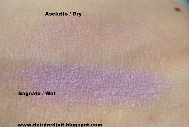 Usato asciutto, secondo me non è granchè perchè è proprio molto molto tenue, un rosa chiarissimo che dona giusto un po’ di perlescenza: da bagnato invece cambia decisamente, acquistando molta intensità e parecchia scrivenza, si possono anche notare i riflessi violetti.