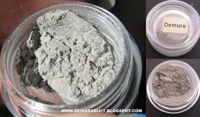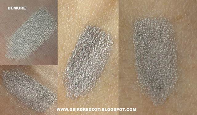 Demure è un grigio che vira n po’ sul verde, con dei leggeri riflessi dorati visibili a seconda della luce.