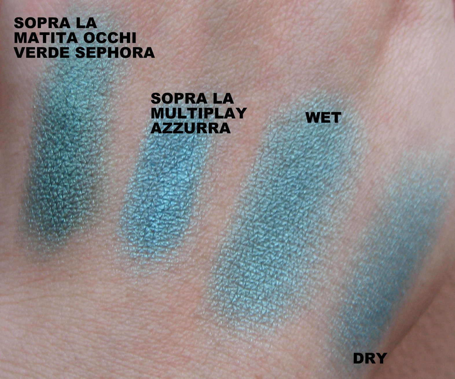 Adesso vi mostro come può essere intensificato usandolo sopra delle matite per occhi: nello specifico, l’ho applicato sopra la Multiplay azzurra della Pupa e sopra la matita Jumbo verde per occhi della Sephora: