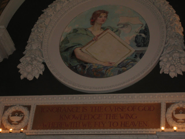 La frase dice che l’ignoranza è una maledizione di Dio, la conoscenza è l’ala con cui voliamo verso il paradiso.. c’erano molte massime di questo tipo incise sulle pareti, un’altra molto bella che mi è piaciuta diceva che i libri devono seguire ciò che ci dice la scienza, e non la scienza ciò che dicono i libri.