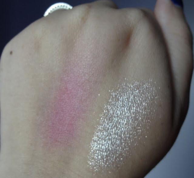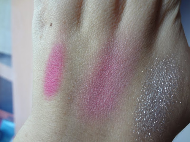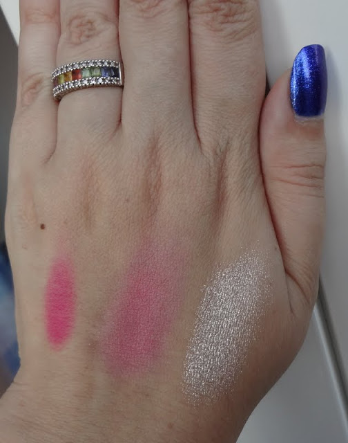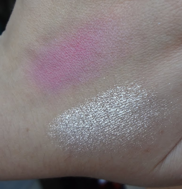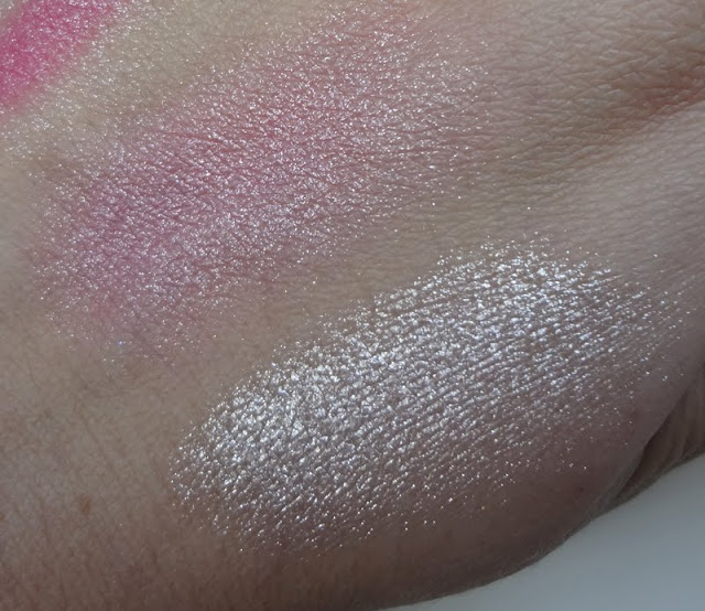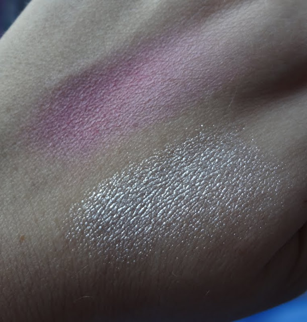 Devo dire che il bianco è molto luminoso e da bagnato rende molto; il rosa invece di suo è piuttosto tenue e poco scrivente: tenete presente che il colore che vedete sulla mano è stato ottenuto dopo 3 applicazioni, e quando è steso sulla palpebra risulta comunque leggerino.