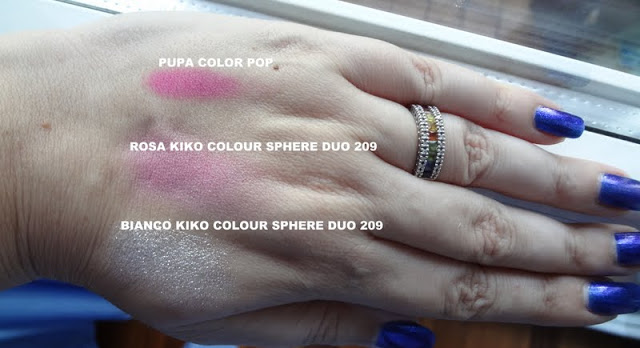 Per un attimo, nella mia sconfinata mancanza di ombretti mat, avevo pensato che questo rosa fosse simile a uno dei Color Pop Pupa usciti quest’estate, il fucsia, ma a un confronto diretto in effetti non c’entrano nulla: come prima cosa, proprio per il colore, infatti il Kiko è rosa mentre il Pupa è fucsia; in secondo luogo, la pigmentazione e la scrivenza sono diversi, infatti nella foto il rosa è stato applicato 3 volte per ottenere un colore più deciso, mentre il fucsia 1 volta sola; infine, un’altra differenza sta nella resistenza del colore, infatti il Kiko (come tutti quelli di questa marca che ho avuto modo di provare) viene via tranquillamente sotto l’acqua corrente, mentre per il Pupa bisogna sfregare più energicamente con acqua e sapone o direttamente con uno struccante.