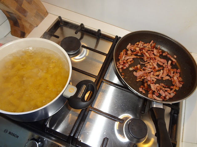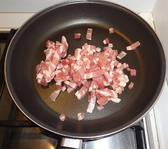 Nel mentre che facevo bollire l’acqua della pasta, ho preso circa 200 gr di pancetta (contati per 4 persone), che se preferite potete sostituire con dello speck, e l’ho messa a rosolare senza ulteriore aggiunta di olio (eh, poi non venitemi a dire che non cucino dietetico!!).