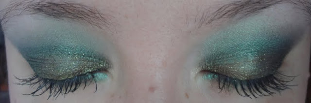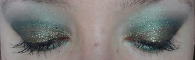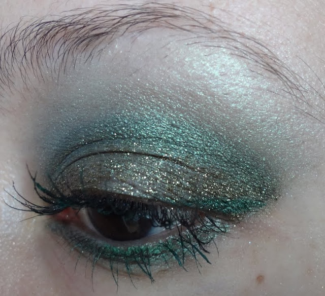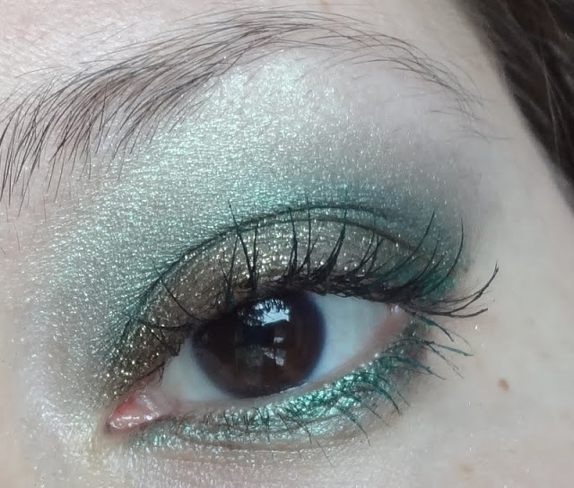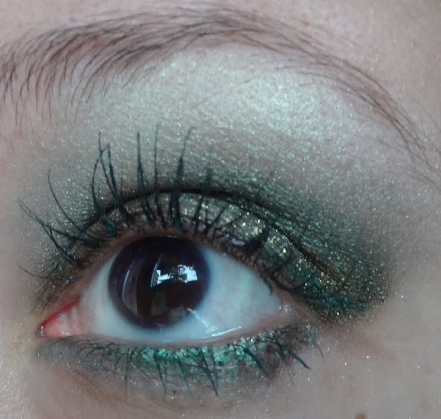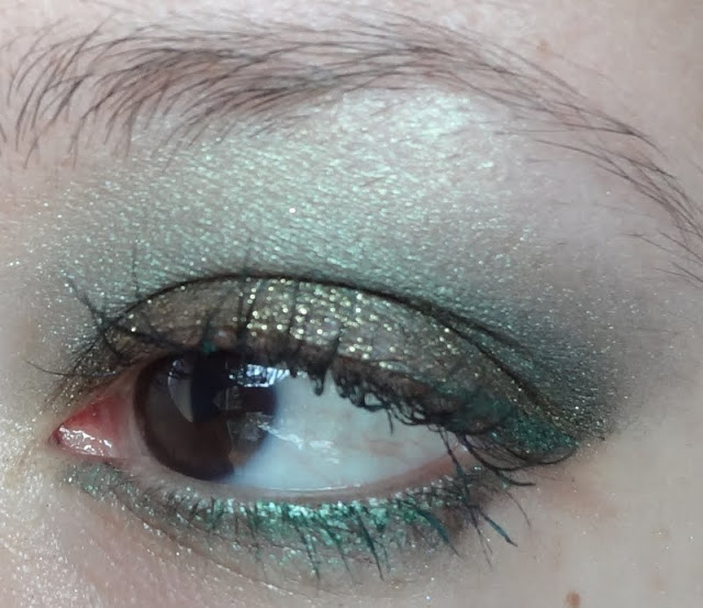 Solito trucchino veloce, ho usato sulla palpebra mobile l’ Eyeglitter Eyeshadow di Layla, per la coda ho usato il colore più scuro della palette Smoky Eyes Bourjois nella colorazione Vert trendy nr 08, per sfumare tra la coda e la palpebra mobile ho usato l’ombretto ColorSphere nr 6 Verde mélange Kiko e infine,per sfumare la coda verso l’alto, ho usato insieme il verde medio e il verde chiaro della palette.