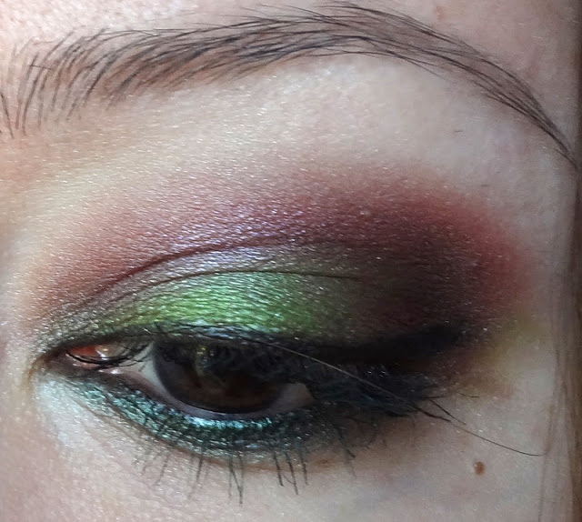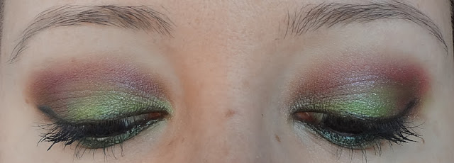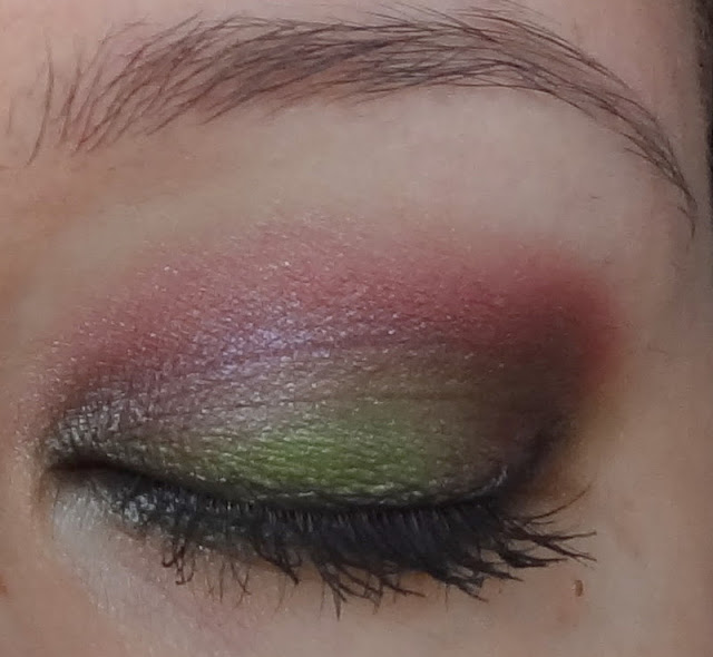 Poi sulla piega della palpebra ho steso il fucsia e ho iniziato a sfumare insieme al verdone…. classica riga di matita nera sulla palpebra superiore, matitona verde sulla palpebra inferiore, mascara e via!