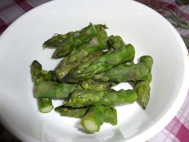 Una volta cotti, scolateli, asciugateli su carta assorbente, tenete da parte le punte e fate a rondelline il resto degli asparagi:
