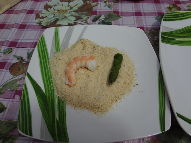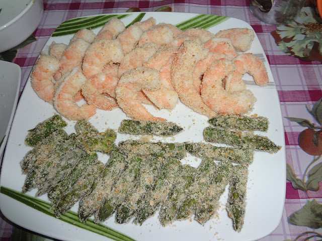 Pulite le mazzancolle e passatele nel pangrattato; fate la stessa cosa con le punte di asparagi che avevate tenuto da parte.