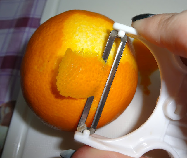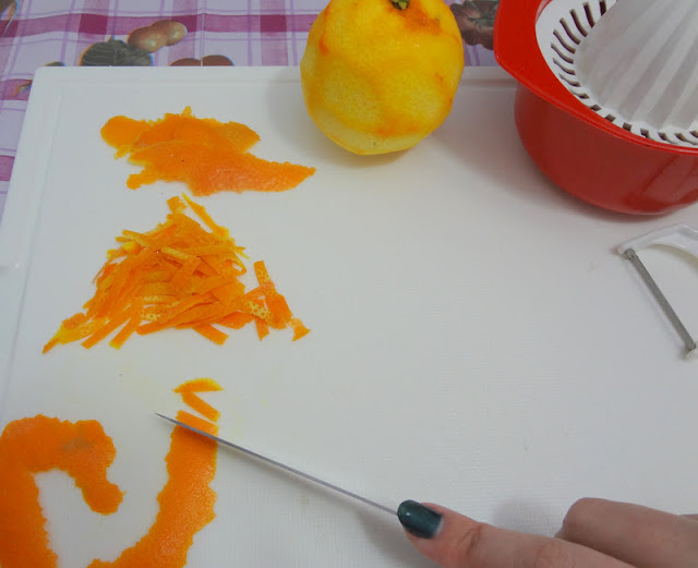 La prima cosa da fare è lavare accuratamente l’arancia e pelarla, però fate in modo che la buccia sia sottile: in pratica, dovete evitare di levare anche la parte bianca perchè è amarognola.