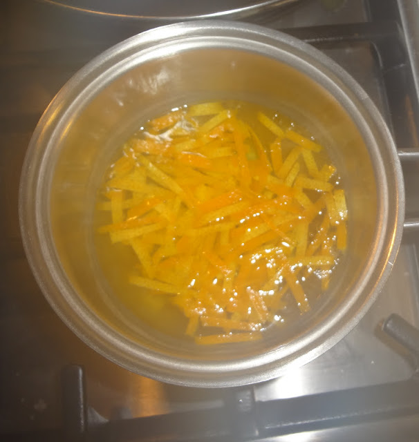 A questo punto, in un pentolino fate scaldare un pochino d’acqua e poi scottate i vostri pezzettini di buccia, teneteli nell’acqua bollente non più di un paio di minuti e poi scolateli.