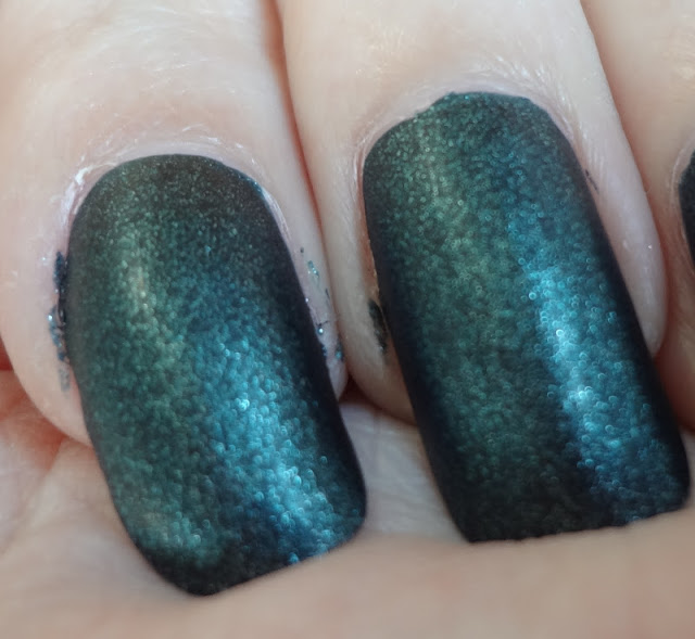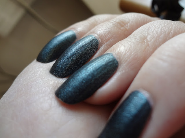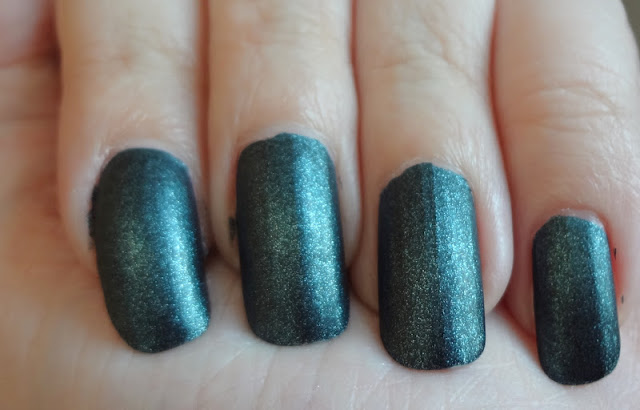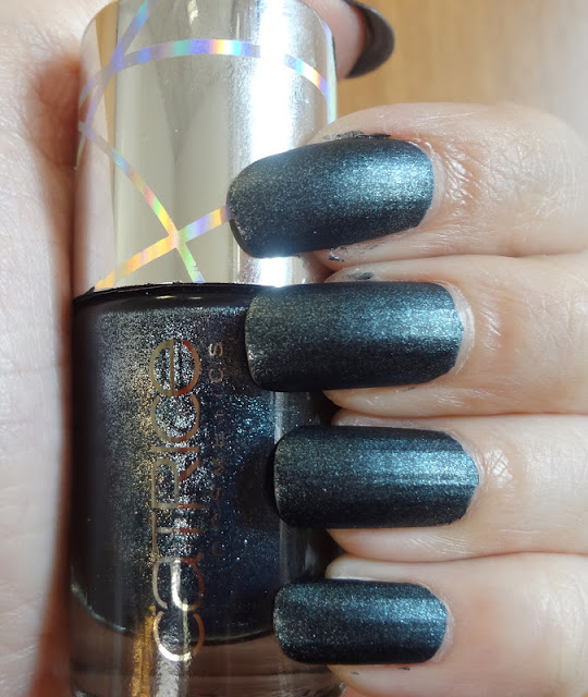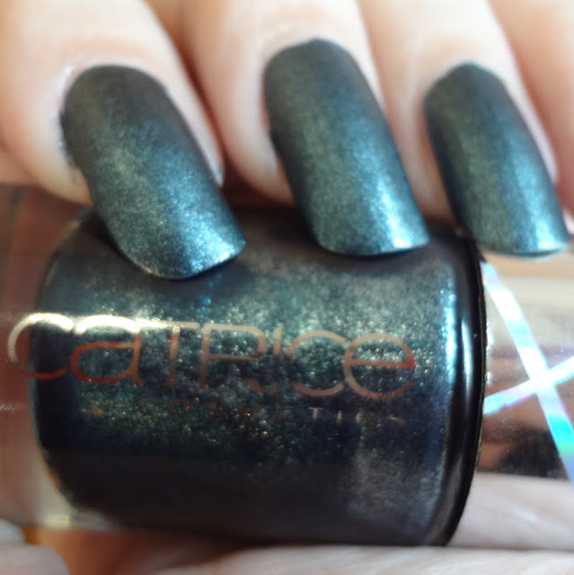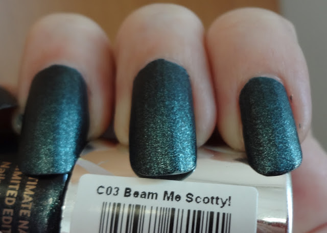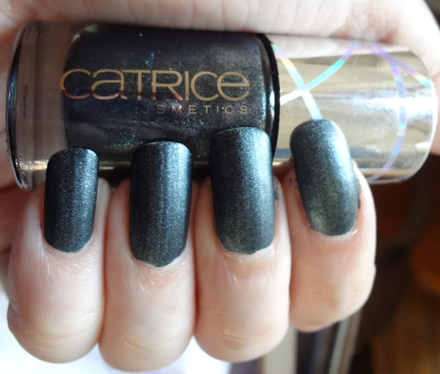 Lui è lo smalto Catrice Beam me Scotty, e fa parte della collezione Out of Space: si tratta di un bellissimo.. ehm dunque.. direi verde foresta, ma che a volte può sembrare un blu scuro, ma anche un teal oppure un grigio, molto luminoso grazie ai piccolissimi glitterini argentati, e dal finish opaco.