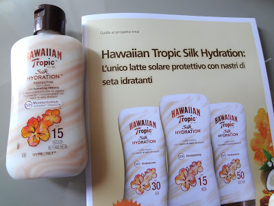 Insieme a circa altri 1500 trnder ho ricevuto una confezione da 180 ml di latte solare della nuova linea Hawaiian Tropic Silk Hydration, più diverse confezioni da 59ml da distribuire in prova e una serie di buoni sconto.
