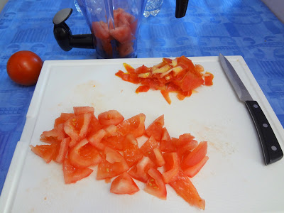 Come prima cosa, vi servono dei pomodori, circa 600 grammi (io ho usato quelli a grappolo): va tolta la polpa con i semini, e poi va tagliato in maniera grossolana (tanto dopo finirà tutto nel frullatore!)