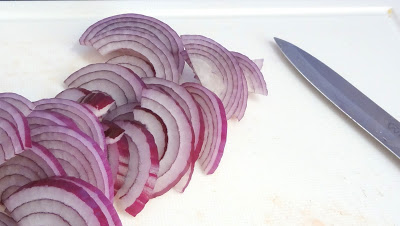 Adesso affettate una bella cipolla (preferibilmente una di quelle rosse di Tropea),