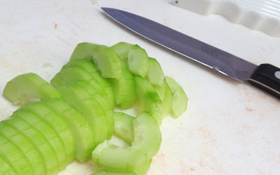 affettate un cetriolo, dopo averlo privato dei semini (basta passarci dentro un cucchiaio),