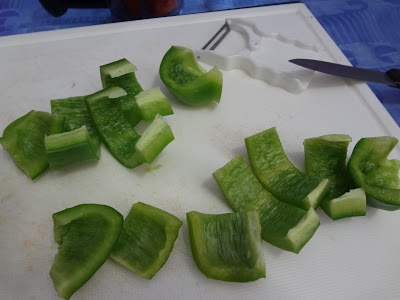 E infine affettate un peperone verde e mezzo peperone rosso: anche qui, il consiglio è di togliere la pelle per evitare di trovarvela a pezzetti nella zuppa, oltre che per rendere il tutto più digeribile.