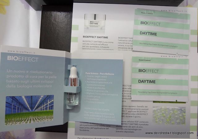7)Infine, abbiamo 3 sample della Bioeffect, azienda che vanta un’avanzata ricerca biotecnologica nel rispetto dell’ambiente: la crema antietà Daytime attiva i processi biologici che contribuiscono a mantenere radiosa la pelle, mentre il siero Egf (3ml) contiene attivatori cellulari a base vegetale, che stimolano il rinnovamento delle cellule della pelle.
