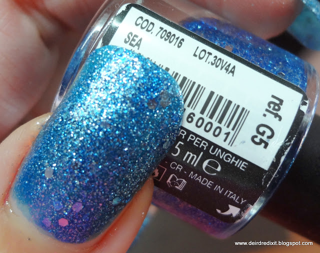 Il quinto smalto è l’azzurro Sea G5, con i suoi glitter più grandi di forma esagonale. Due passate.