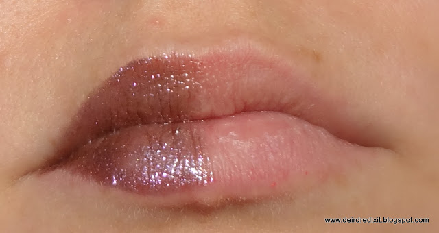 La resa sulla labbra poi, è variabile in base alla luce: con la luce del sole emerge maggiormente il tono marron-rossiccio (nel collage qui sotto, foto della labbra), mentre con la luce fredda rilevano maggiormente i glitterini rosati e il tono del prugna chiaro (foto dello swatch su mano).