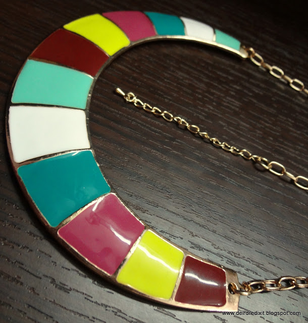 Ma eccovi cosa ho scelto: Colored lunulate pendant necklace nella versione multi colored (se cliccate sul link vedrete che è disponibile anche in versione bicolore bianco e nero), al prezzo di 17$: si tratta di una collana semirigida, con una struttura dorata e 12 inserti multicolor smaltati.