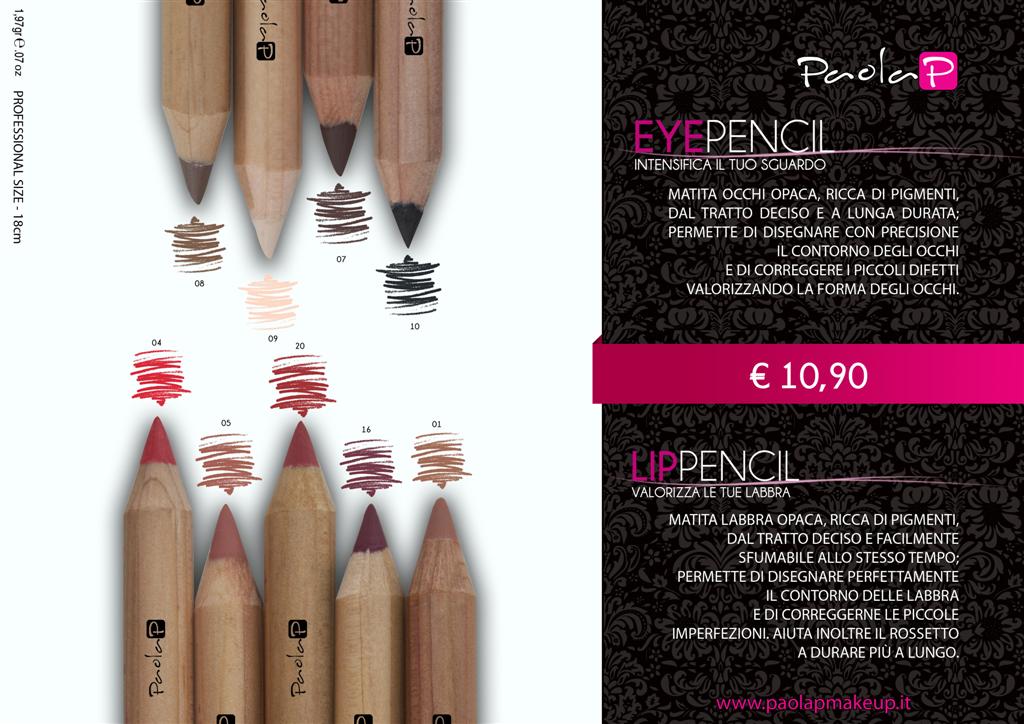 PaolaP Eye Pencil e PaolaP Lip Pencil sono opache e ricche di pigmenti, dal tratto deciso; la matita occhi è a lunga durata e permette di disegnare con precisione il contorno degli occhi e di correggere i piccoli difetti valorizzando la forma degli occhi, mentre la matita labbra è facilmente sfumabile e permette di disegnare perfettamente il contorno delle labbra e di correggerne le piccole imperfezioni. Aiuta inoltre il rossetto a durare più a lungo.
