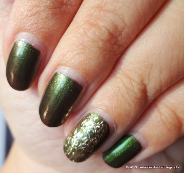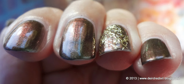 Dato che era possibile farsi applicare lo smalto, ho scelto il colore che mi intrigava maggiormente, vale a dire Cleo’s Talisman, abbinato alle pagliuzze dorate di Season’s Greetings, Sherley per un’accent nail che si fa notare.