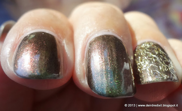 In foto non è stato facile catturare il cambio di colore, tuttavia dal vivo l’effetto duochrome si nota, tanto che in ufficio una collega mi ha chiesto se avessi usato smalti diversi per le varie unghie ^__^