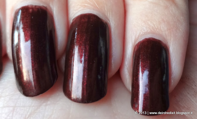 Inizialmente a prima vista l’avevo definito come un bordeaux shimmer con riflessi marroni, dopo averlo messo sulle unghie lo definirei al contrario, cioè come una base marrone con riflessi bordeaux shimmer.. voi che ne dite?