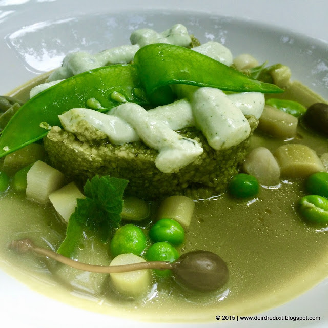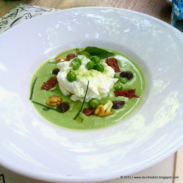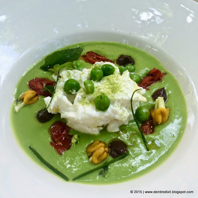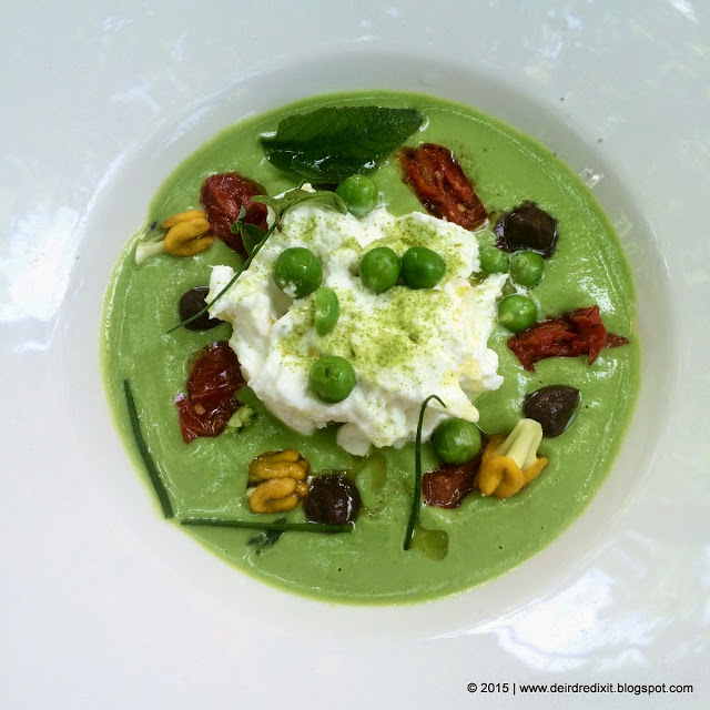Oggi mi sentivo particolarmente green, così ho deciso di iniziare il mio pranzo con una Crema di piselli, stracciatella, pomodori confit e purea di olive nere pugliesi.