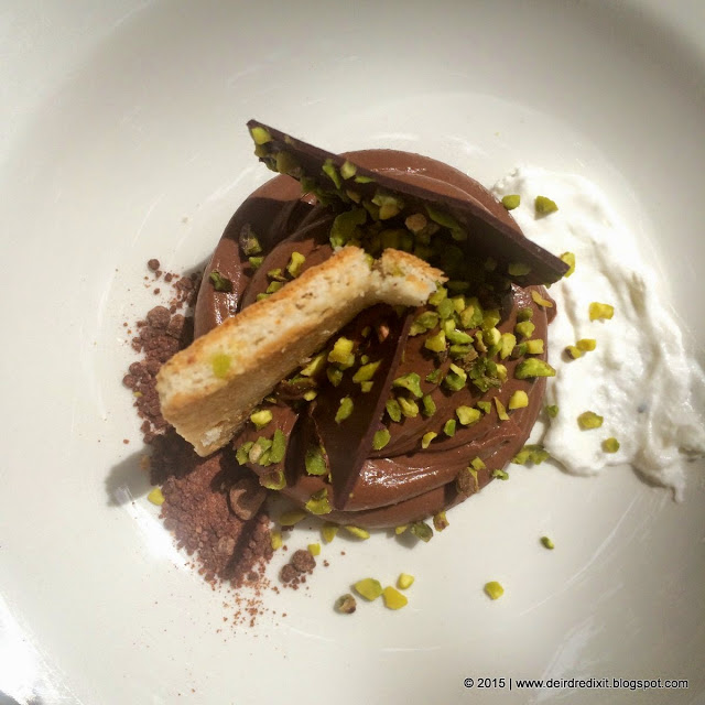 soprattutto per lasciar spazio al dolce, una golosissima Mousse di cioccolato fondente al 70%, panna acida alla menta e pistacchio di Bronte.
